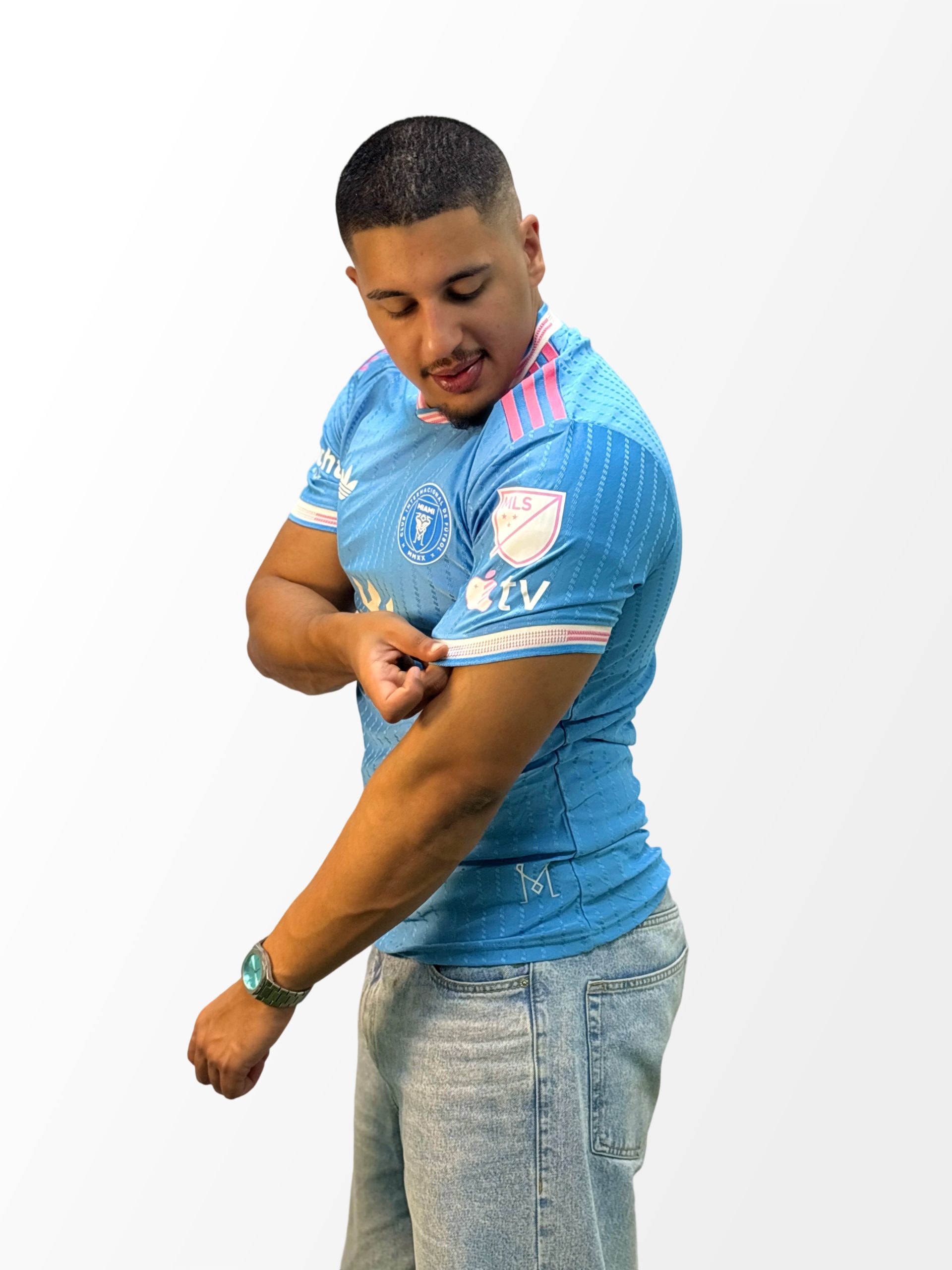 تيشيرت انتر ميامي الجديد لموسم 25/26، يتضمن جميع شعارات الدوري الامريكي الممتاز.