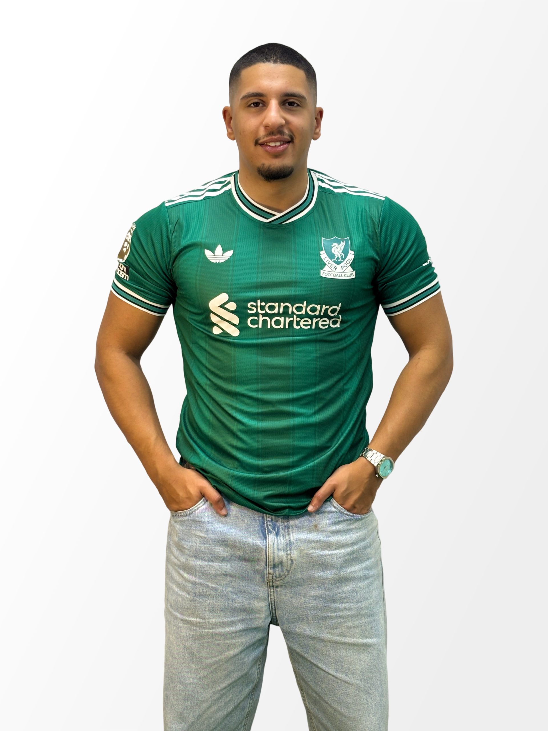 تيشيرت ليفربول الجديد لموسم 25/26، يتضمن جميع شعارات الدوري الإنجليزي الممتاز.