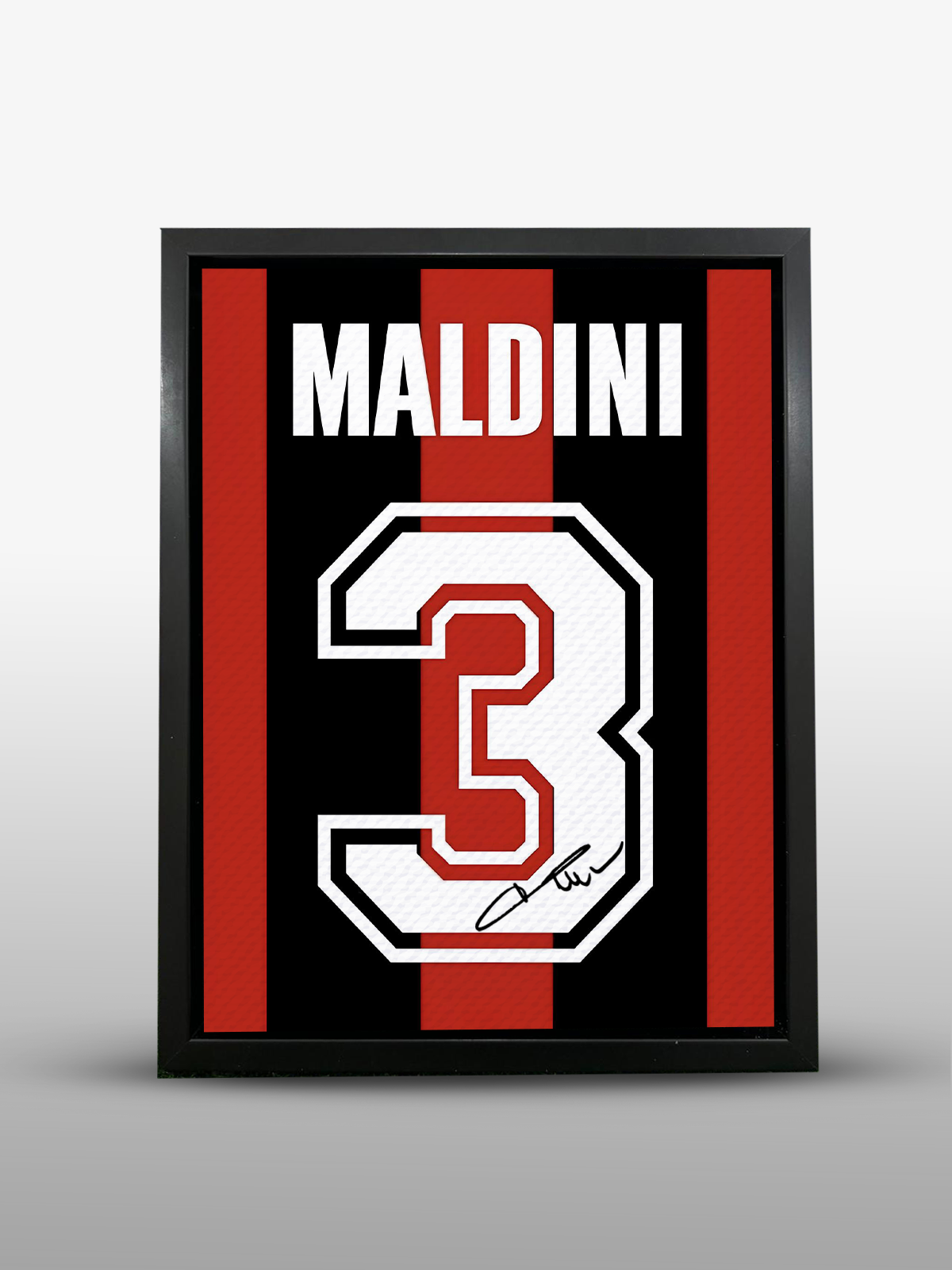 Print of the player’s name and number, Paolo Maldini, with his signature on the board.